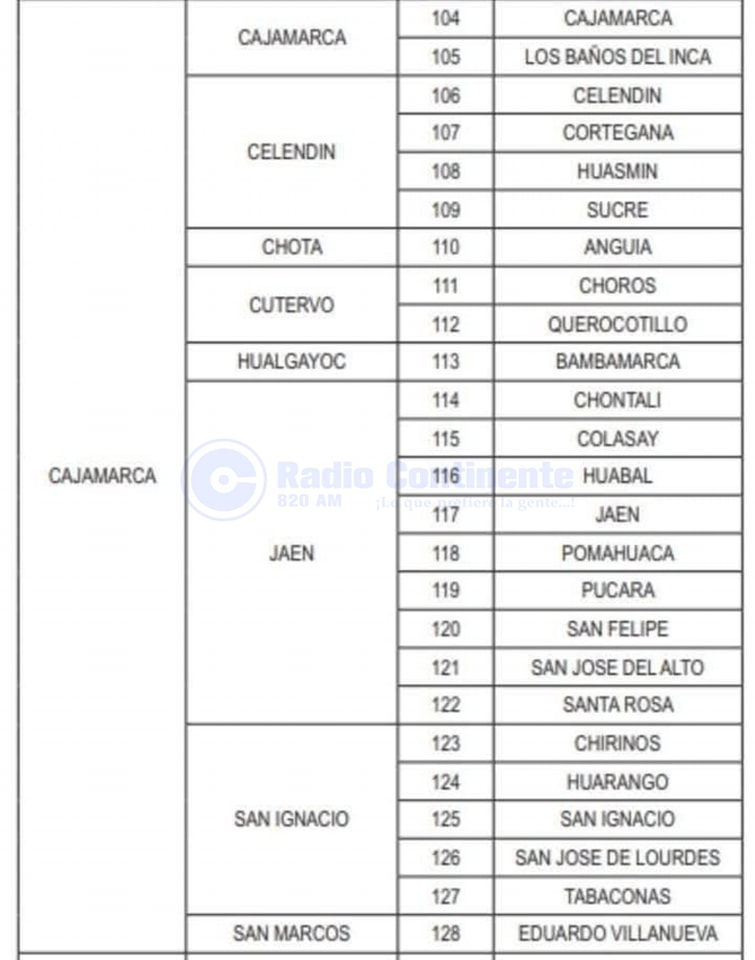 Los distritos comprendidos en la disposición son: Cajamarca y Baños del Inca en la provincia de Cajamarca; Cortegana, Huasmín y Sucre en Celendín; Anguía en Chota; Choros y Querecotillo en Cutervo, Bambamarca en la provincia de Hualgayoc; Chontali, Colasay, Huabal, Jaén, Pomahuaca, Pucará, San Felipe, San José del Alto, Santa Rosa en la provincia de Jaén; Chirinos, Huarango, San Ignacio, San José de Lourdes, Tabaconas, en San Ignacio; Eduardo Villanueva en la provincia de San Marcos