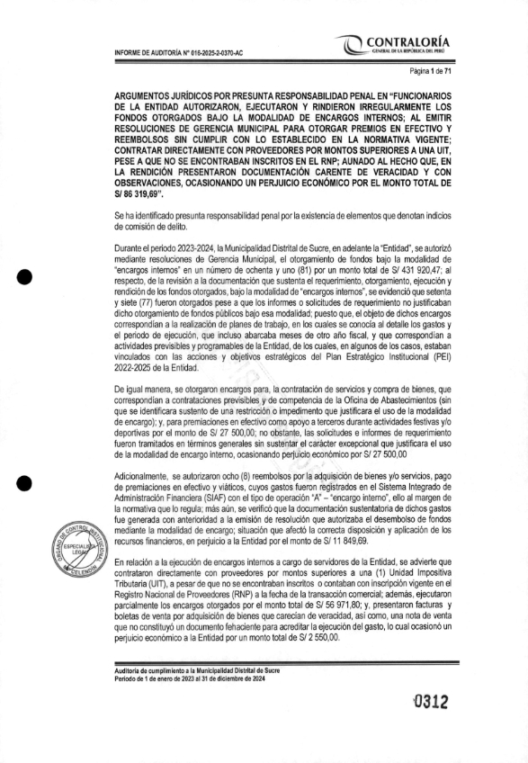 Contraloría recomienda denunciar penalmente a funcionarios de la municipalidad distrital de sucre por haber generado un perjuicio económico a la institución por varios miles de soles, según el informe de contraloría N° 016-2025-2-0370-AC, las persona de: