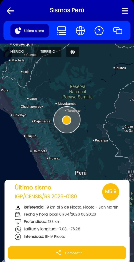 Un sismo de magnitud 5.9, registrado las 60:20 de la mañana de este miércoles y con epicentro a 19 kilómetros al sur de Picota, en la región San Martín, fue percibido en diversas zonas de la región Cajamarca como lo reportaron pobladoresvde toda la región.