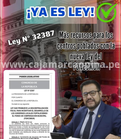 Logramos que la Presidente Dina Boluarte promulgue la Ley N.º 32387, Ley que fortalece el Fondo de Compensación Municipal (FONCOMÚN), promoviendo así una verdadera descentralización fiscal para el desarrollo de los gobiernos locales.